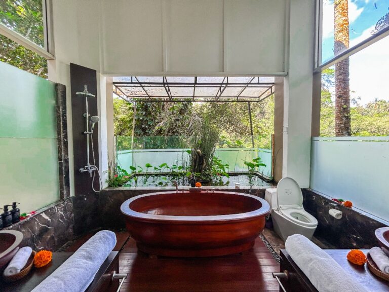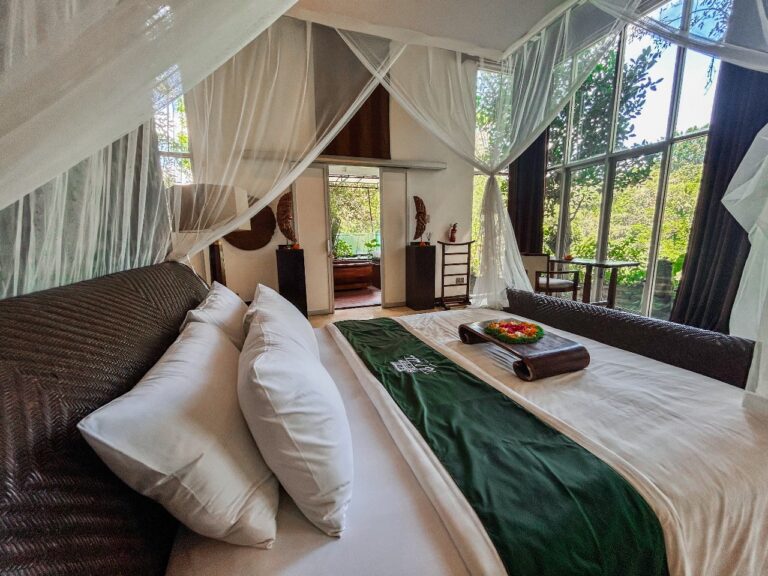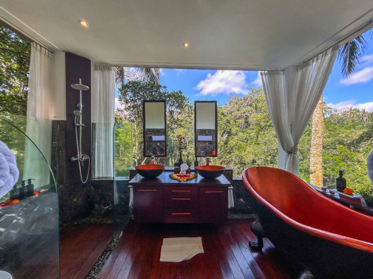 King-size, Double Bed with balcony and large ensuite bathroom with standalone bathtub, all with epic jungle gorge views.